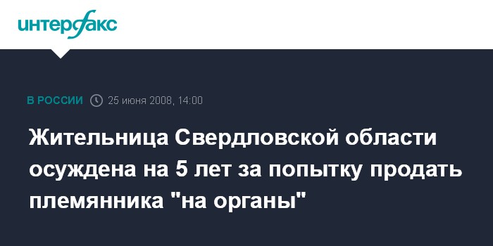 Москва. 24 июня. INTERFAX.RU - Суд города Каменска-Уральского Свердловской области приговорил к 5 годам заключения местную жительницу, которая пыталась заработать, продав "на органы" 22-летнего племянника. Как сообщили агентству "Интерфакс" в пресс-службе Свердловского областного суда, она будет отбывать наказание в колонии общего режима. Приговор может быть обжалован в течение 10 суток.