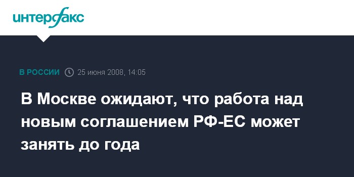 Москва. 25 июня. INTERFAX.RU - Работа над новым базовым соглашением между Россией и ЕС может продлиться в течение года, сообщил "Интерфаксу" источник в Кремле. Он также отметил, что Россия, когда не по ее вине затянулся процесс принятия решений о новом соглашении, "предлагала обсудить его хотя бы на экспертном уровне", однако это предложение принято не было. "И поэтому мы считаем, что самым важным результатом встречи будет принятие решения о запуске переговоров по подготовке будущего соглашения", - сказал источник.