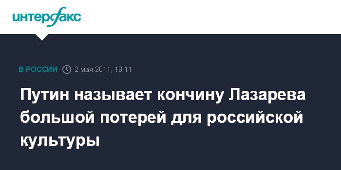 Москва. 2 мая. INTERFAX.RU - Председатель правительства России Владимир Путин выразил глубокие соболезнования в связи с кончиной народного артиста РСФСР, актера Московского академического театра имени Вл.Маяковского Александра Лазарева, сообщила пресс-служба правительства России. "Это большая потеря для российской культуры, отечественного искусства, для театра имени Вл.Маяковского, который стал для Александра Лазарева по-настоящему родным", - говорится в телеграмме премьера.