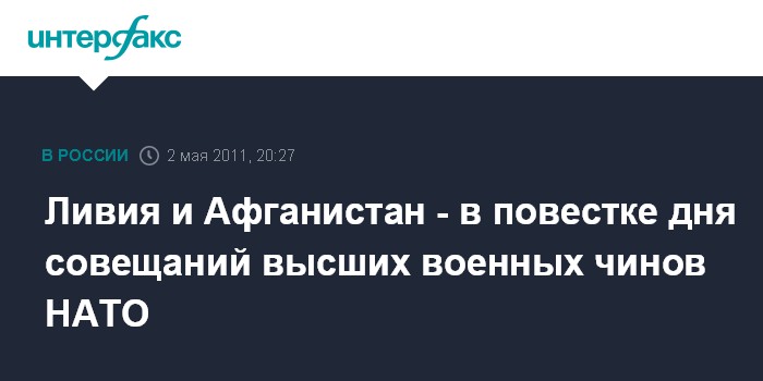Брюссель. 2 мая. ИНТЕРФАКС. - Военные операции НАТО и партнеров в Ливии и Афганистане будут центральными темами совещаний высших военачальников в брюссельской штаб-квартире НАТО 4 и 5 мая.