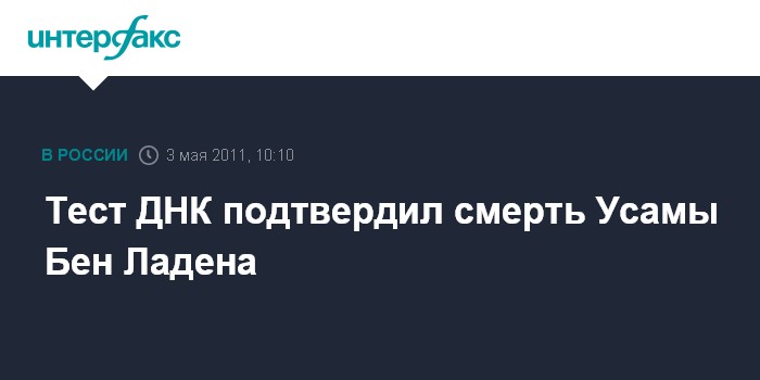 Москва. 3 мая. INTERFAX.RU - Результаты теста ДНК подтвердили, что в пакистанском городе Абботабаде был действительно ликвидирован лидер международной террористической группировки "Аль Каида" Усама бен Ладен, сообщила в понедельник вечером телекомпания НТВ.