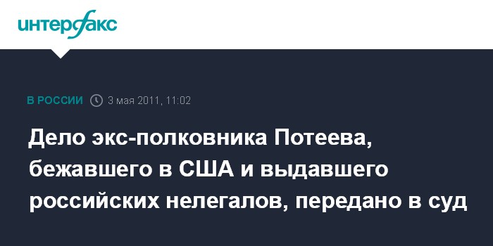 Москва. 3 мая. INTERFAX.RU - ФСБ России сообщает о завершении расследования уголовного дела в отношении бывшего полковника Александра Потеева, который выдал группу российских разведчиков-нелегалов, задержанных в США в прошлом году.