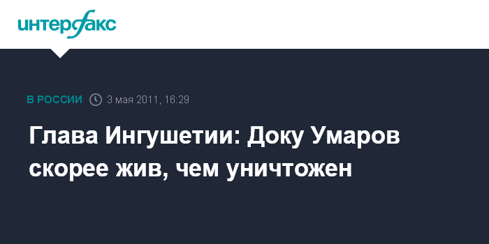 "Исследования методом ДНК проб, взятых от ликвидированных в районе Верхнего Алкуна боевиков, показали, что данных о том, что уничтожен Доку Умаров нет . Следственные органы официально объявили, что среди проверенных данных результатов ДНК Доку Умарова не обнаружено, поэтому есть вероятность, что он больше жив, чем уничтожен", - заявил в интервью агентству "Интерфакс-Юг" глава Ингушетии.