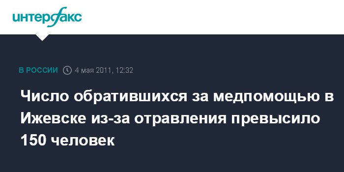 Как сообщалось ранее, по состоянию на вторник общее число граждан, пострадавших от массового отравления в Ижевске и обратившихся за медпомощью, составляло 123 человека. Таким образом, за день число пострадавших от отравления выросло на 30 человек.