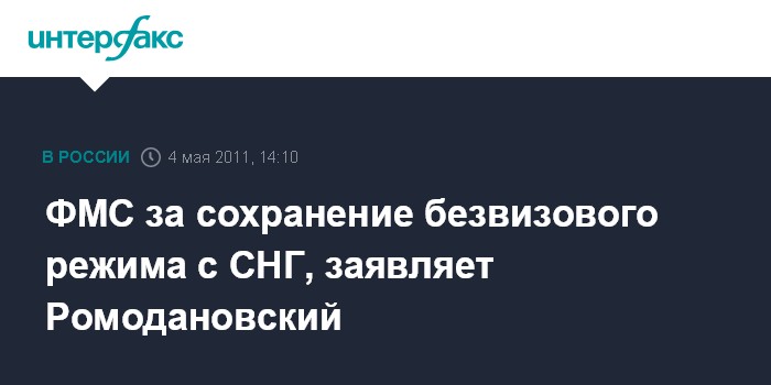 Москва. 4 мая. INTERFAX.RU - Федеральная миграционная служба (ФМС) выступает за сохранение безвизового режима между Россией и странами СНГ, отмечая при этом необходимость не допустить безработицу среди иностранных трудовых мигрантов на территории РФ.