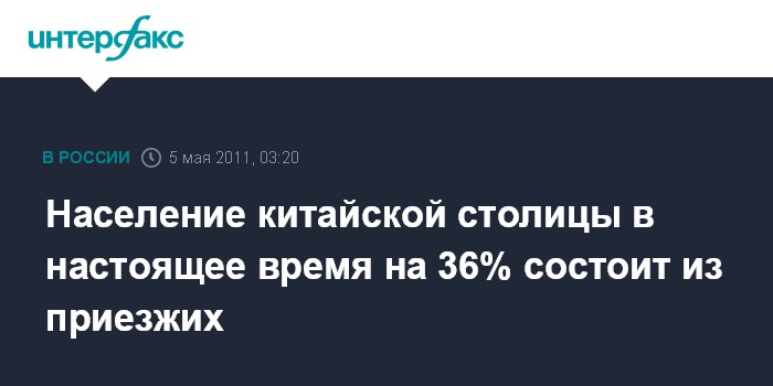Пекин. 5 мая. ИНТЕРФАКС-КИТАЙ - В настоящее время из 19 млн 621 тыс. человек населения китайской столицы Пекина 35,9% составляют приехавшие и обосновавшиеся в городе выходцы из других районов страны,