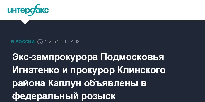 Москва. 5 мая. INTERFAX.RU - Бывший зампрокурора Московской области Александр Игнатенко и прокурор Клинского района Эдуард Каплун объявлены в федеральный розыск, сообщил в четверг в Басманном суде следователь СКР.
