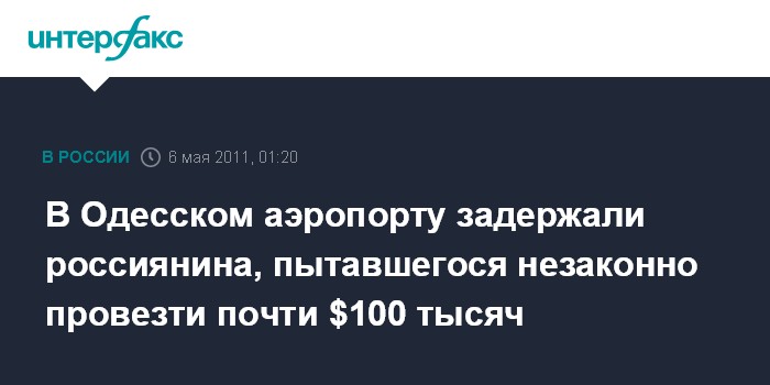 Одесса. 6 мая. ИНТЕРФАКС-УКРАИНА - Сотрудники Южной таможни задержали в международном аэропорту "Одесса" гражданина РФ, который пытался незаконно ввезти на Украину $94 тысяч, сообщает в четверг пресс-служба таможни.
