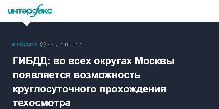 "В целях улучшения приема населения, а также сокращения очередей в подразделениях ГИБДД с 6 мая 2011 года во всех административных округах города Москвы организован прием граждан по вопросам прохождения технического осмотра в круглосуточном режиме", - сказал сотрудник пресс-службы "Интерфаксу" в пятницу.