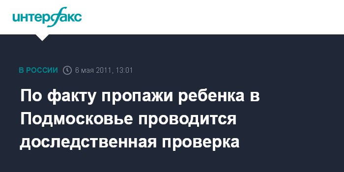 "Следственным отделом по городу Можайску ГСУ Следственного комитета РФ по Московской области проводится доследственная проверка по заявлению жительницы города Ликино-Дулево Орехово-Зуевского района о безвестном отсутствии ее шестилетнего ребенка", - сообщила "Интерфаксу" официальный представитель управления Ирина Гуменная.