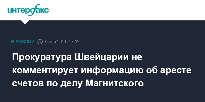 Лондон/Москва. 6 мая. INTERFAX.RU - Представители швейцарской прокуратуры в ответ на запрос BBC не подтвердили и не опровергли факт ареста банковских счетов российских чиновников, причастных к делу о смерти юриста фонда Hermitage Capital Сергея Магнитского.