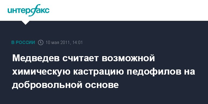 Горки. 10 мая. INTERFAX.RU - Президент РФ Дмитрий Медведев считает, что к лицам, совершившим преступления сексуального характера в отношении детей, необходимо применять самые жесткие меры, вплоть до химической кастрации, но полагает, что она возможна только на добровольной основе.