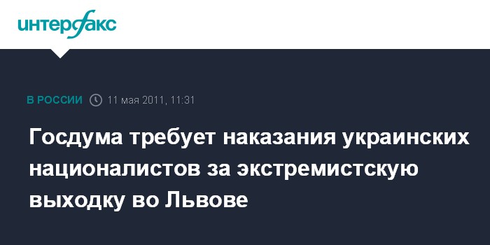 "Депутаты Государственной Думы считают, что организаторы и участники кощунственных провокаций во Львове должны быть незамедлительно наказаны в соответствии с законодательством Украины", - говорится в заявлении "В связи с экстремистскими проявлениями в г.Львове во время празднования Дня Победы", которое Госдума приняла в среду за основу.