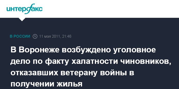 "Следственными органами Следственного комитета РФ по Воронежской области возбуждено уголовное дело по признакам преступления, предусмотренного ст. 293 УК РФ (халатность) по факту нарушения прав и законных интересов ветерана", - сообщил "Интерфаксу" в среду официальный представитель СК РФ Владимир Маркин.