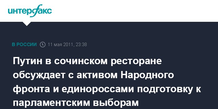 Москва. 11 мая. ИНТЕРФАКС - Премьер РФ Владимир Путин проводит в Сочи неформальную встречу с активом Общероссийского народного фронта и руководством "Единой России". На ней обсуждаются как вопросы создания самого фронта, так и ряд других актуальных вопросов, включая подготовку к предстоящим в декабре парламентским выборам.