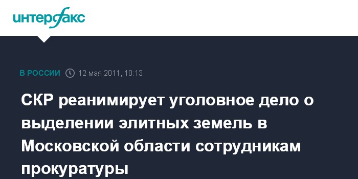 Москва. 12 мая. INTERFAX.RU - Следственные органы РФ пытаются реанимировать уголовное дело о незаконном выделении элитных земель в Подмосковье сотрудникам прокуратуры, суда и милиции, которое Мособлпрокуратура дважды признавало незаконным, пишет в четверг газета "Коммерсант".