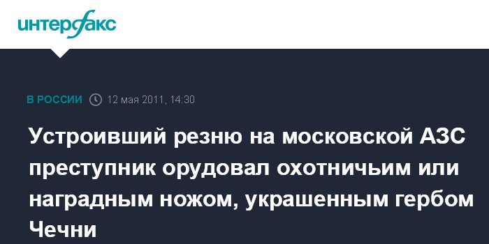 Москва. 12 мая. INTERFAX.RU - Лезвие ножа, который использовал преступник, зарезавший двух человек на автозаправке на Бутырской улице, украшено гербом Чеченской республики, сообщил "Интерфаксу" источник в правоохранительных органах в четверг.
