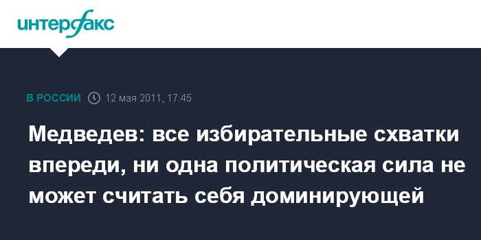 Москва. 12 мая. INTERFAX.RU - Президент России Дмитрий Медведев уверен, что исход выборов в Думу не известен, все политические схватки впереди и ни одна партия не может себя считать доминирующей.