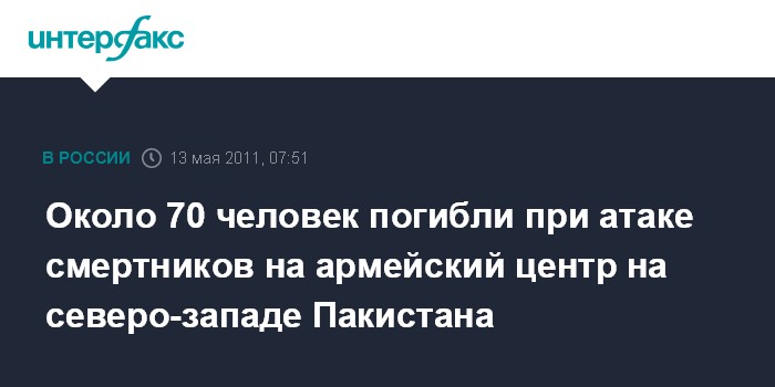 Лондон. 13 мая. ИНТЕРФАКС - Жертвами нападения смертников на армейский центр военной подготовки в городе Шабкадар на северо-западе Пакистана стали 68 человек, сообщает британская телерадиовещательная корпорация Би-би-си со ссылкой на местную полицию.