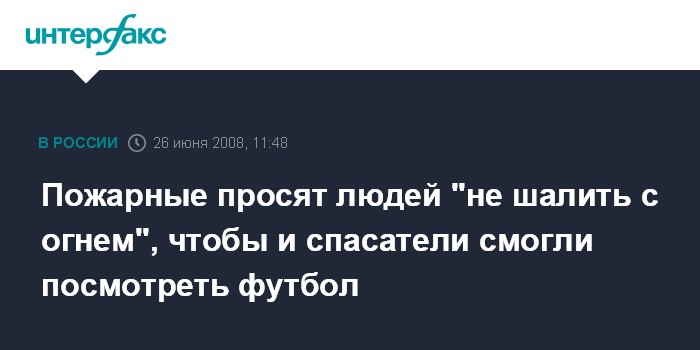 Москва. 26 июня. INTERFAX.RU - Пожарные Петербурга просят жителей города в четверг вечером особенно щепетильно отнестись к обращению с огнем, чтобы и сотрудники МЧС смогли, не выезжая по тревогам, посмотреть полуфинал чемпионата Европы Россия-Испания.