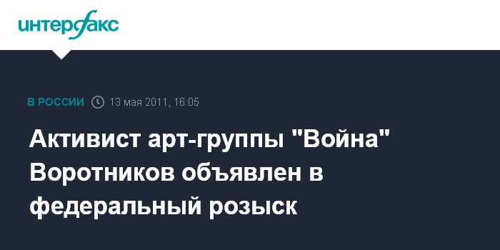 Санкт-Петербург. 13 мая. INTERFAX.RU - Активист и один из лидеров арт-группы "Война" Олег Воротников объявлен в федеральный розыск, сообщил "Интерфаксу" в пятницу официальный представитель главного следственного управления СКР по Петербургу Сергей Капитонов.