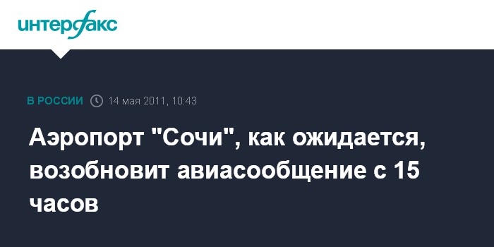 Сочи.14 мая. INTERFAX.RU - Международный аэропорт "Сочи" планирует возобновить авиасообщение, прерванное ранее из-за непогоды, с 15 часов субботы. "Первый рейс из аэропорта "Сочи" будет отправлен в 15:00", - сообщил агентству "Интерфакс-Юг" пресс-секретарь компании "Базел Аэро" Олеся Еремина. Она отметила, что синоптики прогнозируют улучшение погоды. "Аэропорт планирует полностью возобновить авиасообщение", - подчеркнула пресс-секретарь.