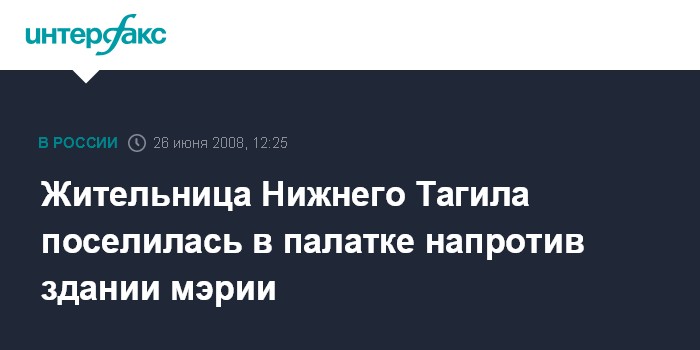 Москва. 26 июня. INTERFAX.RU - Жительница Нижнего Тагила (Свердловская область) Светлана Карнаухова сегодня разбила палатку напротив здания мэрии города, требуя предоставить ей и ее дочери жилье.