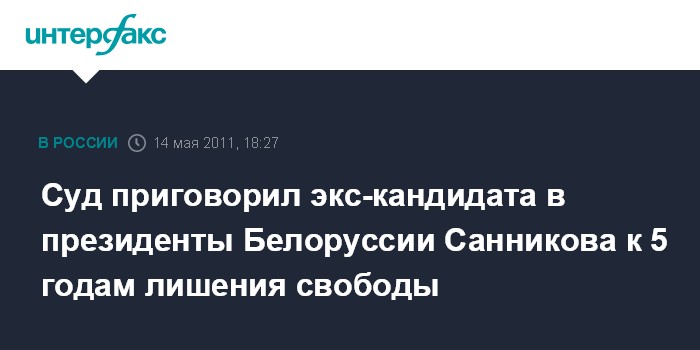 Минск. 14 мая. INTERFAX.RU - Суд Партизанского района Минска признал экс-кандидата в президенты Белоруссии Андрея Санникова виновным в организации массовых беспорядков в Минске и приговорил его к 5 годам лишения свободы с отбыванием наказания в колонии усиленного режима, передает корреспондент агентства "Интерфакс-Запад" из зала суда.