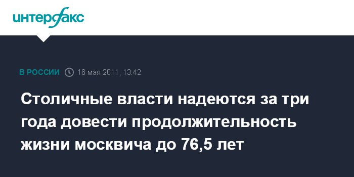 Москва. 16 мая. INTERFAX.RU - Московские власти рассчитывают в результате реализации программы развития городского здравоохранения увеличить среднюю продолжительность жизни в городе до 76,5 лет, заявила заместитель мэра Москвы по вопросам образования и здравоохранения Ольга Голодец.