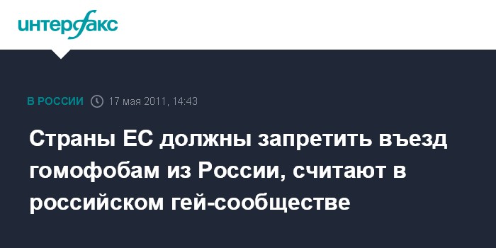 Москва. 17 мая. INTERFAX.RU - Российское гей-сообщество намерено предложить властям различных стран запретить въезд на их территорию представителей РФ, которые, по мнению сексменьшинств, придерживаются гомофобских взглядов, сообщил лидер гей-движения Николай Алексеев.