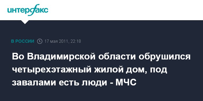 Москва. 17 мая. ИНТЕРФАКС - В городе Струнино Владимирской области произошло обрушение в жилом доме, предположительно под завалами есть люди, сообщает МЧС РФ.