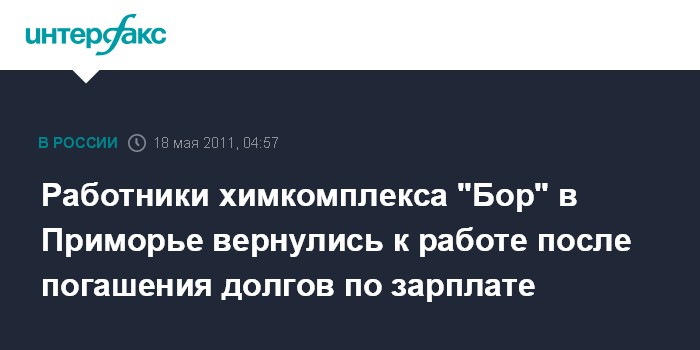 Владивосток. 18 мая. ИНТЕРФАКС-ДАЛЬНИЙ ВОСТОК - Руководство горно-химического комплекса "Бор" в Приморье (г. Дальнегорск) погасило долги по зарплате перед работниками, которые в знак протеста ранее отказались выполнять свои обязанности.