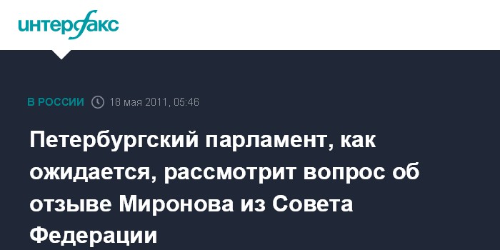 Санкт-Петербург. 18 мая. ИНТЕРФАКС СЕВЕРО-ЗАПАД - Законодательное собрание Петербурга на заседании в среду может рассмотреть проект постановления об отзыве Сергея Миронова с поста спикера Совета Федерации.