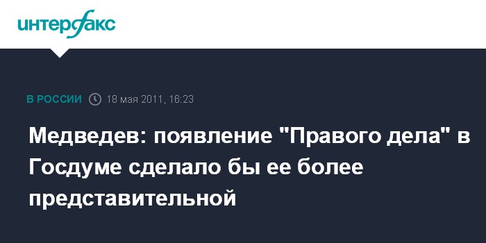 Сколково. 18 мая. INTERFAX.RU - Президент РФ Дмитрий Медведев считает, что присутствие "Правого дела" в парламенте расширило бы представительство правых кругов и, тем самым, пошло бы на пользу Госдуме.