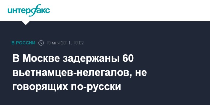Москва. 19 мая. INTERFAX.RU - Более 60 нелегальных мигрантов из Вьетнама задержаны на севере Москвы, сообщила "Интерфаксу" в четверг и.о. пресс-секретаря Федеральной миграционной службы Залина Корнилова.