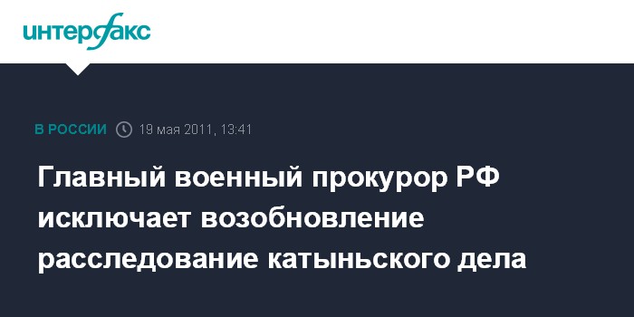 Москва. 19 мая. INTERFAX.RU - Оснований для возобновления расследования уголовного дела по Катыни нет, заявил "Интерфаксу" главный военный прокурор РФ Сергей Фридинский.