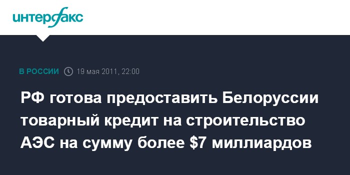 Минск.19 мая. INTERFAX.RU - Россия готова предоставить Белоруссии кредит на строительство АЭС только товарами и услугами на сумму более $7 миллиардов, заявил глава Минфина Алексей Кудрин.