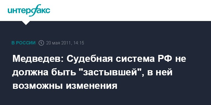 Санкт-Петербург. 20 мая. INTERFAX.RU - Президент РФ Дмитрий Медведев допускает возможность изменений в российской судебной системе, связанных с процедурой обжалования судебных решений.