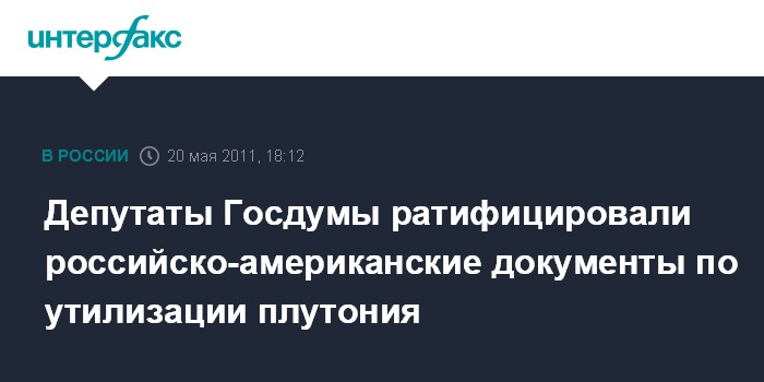 Москва. 20 мая. INTERFAX.RU - Государственная дума в пятницу ратифицировала российско-американское соглашение, а также два протокола к нему, касающиеся утилизации плутония.