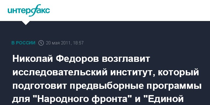 Москва. 20 мая. INTERFAX.RU - Премьер-министр РФ Владимир Путин поручил Николаю Федорову возглавить Институт социально-экономических и политических исследований, который займется подготовкой предвыборной программы для "Народного фронта" и "Единой России".