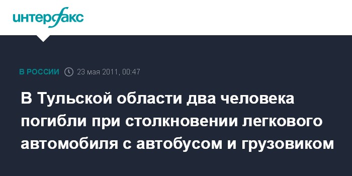 Тула. 23 мая. ИНТЕРФАКС-ЦЕНТР - В Тульской области произошло столкновение пассажирского автобуса, грузовой машины и "ВАЗ-2010", в результате погибли два человека, еще восемь человек получили травмы.
