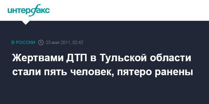 Тула. 23 мая. ИНТЕРФАКС-ЦЕНТР - В Алексинском районе Тульской области в результате ДТП погибли пять человек, еще пятеро человек получили ранения, сообщил "Интерфаксу" руководитель пресс-службы УГИБДД региона Владимир Мигунов.