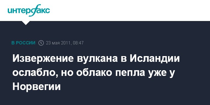Извержение вулкана в Исландии ослабло, но облако пепла уже у Норвегии