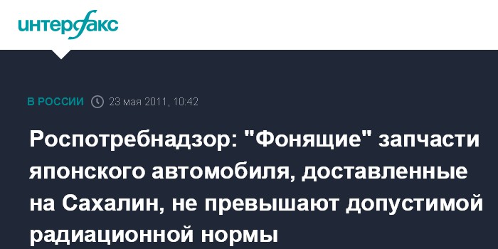 Южно-Сахалинск. 23 мая. INTERFAX.RU- Превышения допустимой нормы радиационного фона на запчастях японской иномарки, задержанной 17 мая при выгрузке теплохода в порту города Корсакова (юг Сахалина), не выявлено, сообщил журналистам заместитель руководителя ТУ Роспотребнадзора по Сахалинской области Андрей Бянкин.