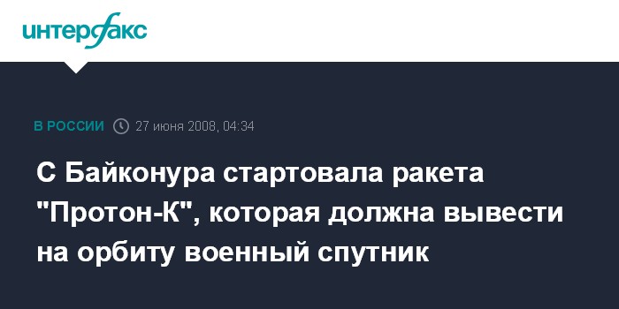 Байконур. 27 июня. ИНТЕРФАКС-АВН - Ракета-носитель "Протон-К" с космическим аппаратом военного назначения запущена с космодрома Байконур, сообщил корреспондент "Интерфакса-АВН".