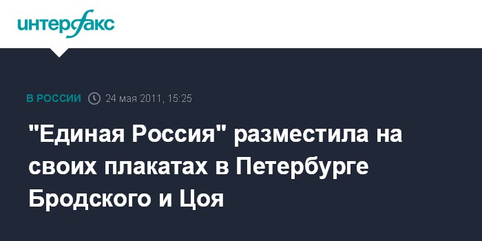 Санкт-Петербург. 24 мая. INTERFAX.RU - Портреты Иосифа Бродского, Александра Пушкина, Виктора Цоя, Дмитрия Лихачева, Александра Блока и других известных петербуржцев размещены на поздравительных плакатах ко Дню города под символикой партии "Единая Россия".