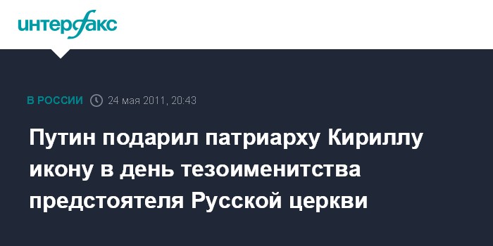 Москва. 24 мая. INTERFAX.RU - Премьер-министр РФ Владимир Путин поздравил во вторник с тезоименитством патриарха Московского и всея Руси Кирилла, подарил ему икону и отметил вклад Русской Православной церкви в сохранении культурных традиций нации.