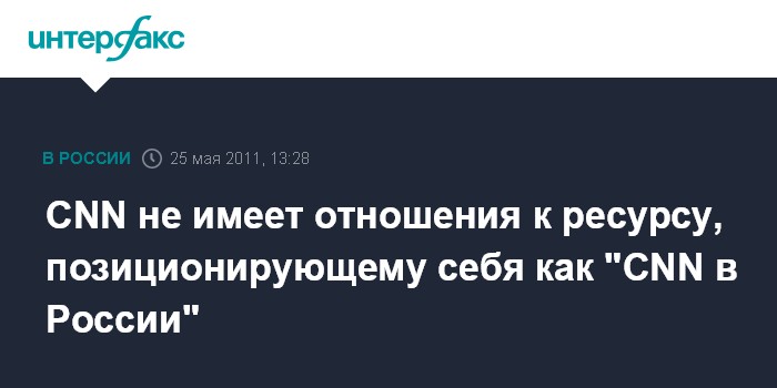 Москва. 25 мая. INTERFAX.RU – Представители Turner Broadcasting System заявили, что компания не имеет отношения к функционирующему в Рунете сайту cnnrussia, заявляющему, что является неофициальным сайтом CNN в РФ, а также аккаунту данного ресурса в Facebook, сообщающему в графе информация "CNN – в России".