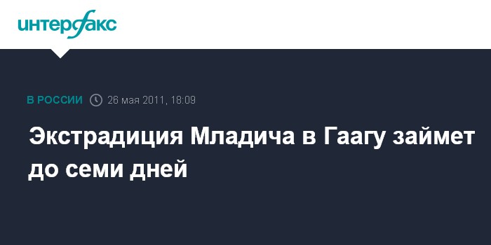 Лондон. 26 мая. INTERFAX.RU - Процедура экстрадиции бывшего лидера боснийских сербов Ратко Младича в Гаагу может занять до семи дней, передает в четверг телерадиокорпорация BBC со ссылкой на прокуратуру Сербии.