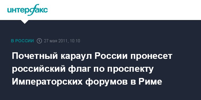 Москва. 27 мая. INTERFAX.RU - Военнослужащие Почетного караула России 2 июня примут участие в военном параде в Риме в честь 150-й годовщины объединения Италии и пронесут российский флаг по проспекту Императорских форумов.